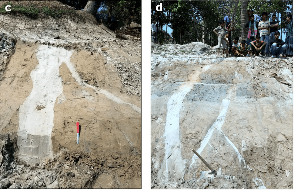 Deprem ve nehir yatağının değişmesi gömülü çökeltiler incelenerek yeniden yapılandırılmıştır. Deprem anındaki sürekli sarsıntılar basınçlı kumu üstteki çamur katmanlarına enjekte edebilir. Bu fenomen deltaların yumuşak sedimentlerinde dikey kum bentleri ya da “sismitler” olarak kaydedilmiştir. Bu olgunun modern örnekleri dünyanın dört bir yanında bulunmaktadır.