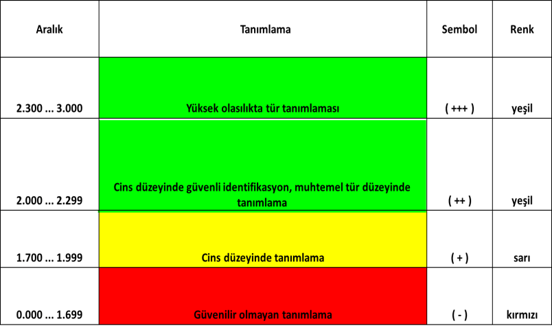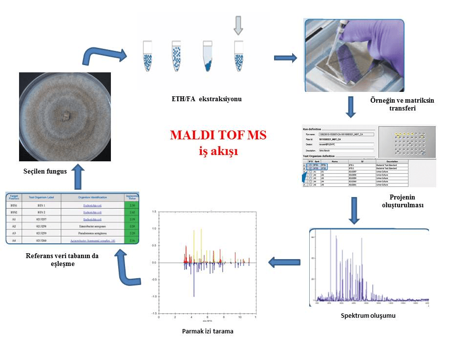 Hatay Mustafa Kemal Üniversitesi Bitki Sağlığı Kliniği Uygulama ve Araştırma Merkezi’nde hizmet verilmekte olan, Matrix asisted laser desorption ionization- time of flight mass spectrometry (MALDI-TOF MS) Mikroorganizma Tanımlama cihazında etanol formik asit ekstraksiyonu yöntemi ile elde edilen proteinler protein parmak izi eşleşmesi şeklinde kütüphane taraması yapılarak mikorganizmaların (bakteri, maya ve fungus) tanısı ortaya konulmaktadır. Cihazın flex kontrol yazılım programı (Biotyper 3.0; Microflex LT; Bruker Daltonics GmbH, Bremen, Germany) ile elde edilen spektrumlar, Maldi Biotyper Real-Time Classification (RTC) yazılımı (version.9) ile karşılaştırılarak tanı işlemi sürdürülmüştür. Analiz sonucunda, 1.700-3.000 arasında sarı/yeşil renkli olarak belirlenen veriler, güvenilir skor değeri olarak kabul edilmektedir. ( Uysal ve ark., 2018;Uysal, 2019; Uysal ve ark., 2020; Uysal ve ark. 2022).