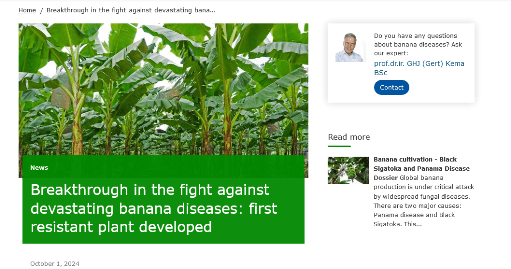 WUR da çalışan profesör Gert Kama Yelloway One adını verdiği ve Muz yetiştiriciliğinde büyük bir atılım olan yeni hibriti hakkında;
