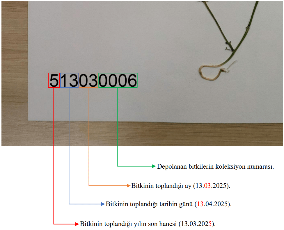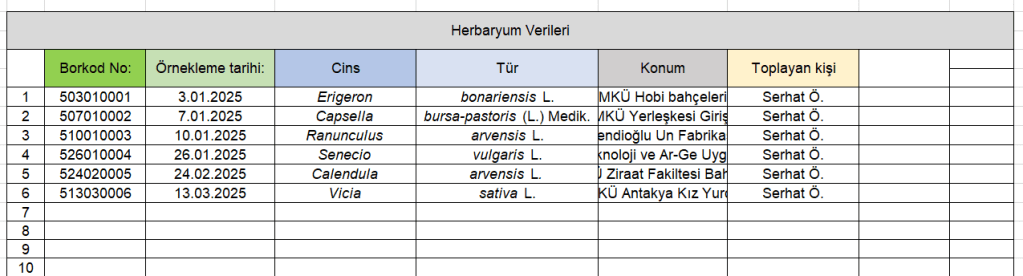 Koleksiyonda depolanan bitki örneklerinin her biri için yukarıda görüldüğü biçimde barkod ataması yapılmaktadır. Bu şekilde karışıklıklar ve hatalar elemine edilir. Bütün veriler excel dosyası olarak kayıt altına alınır (Şekil 5.0).