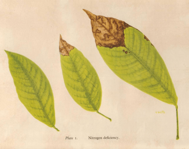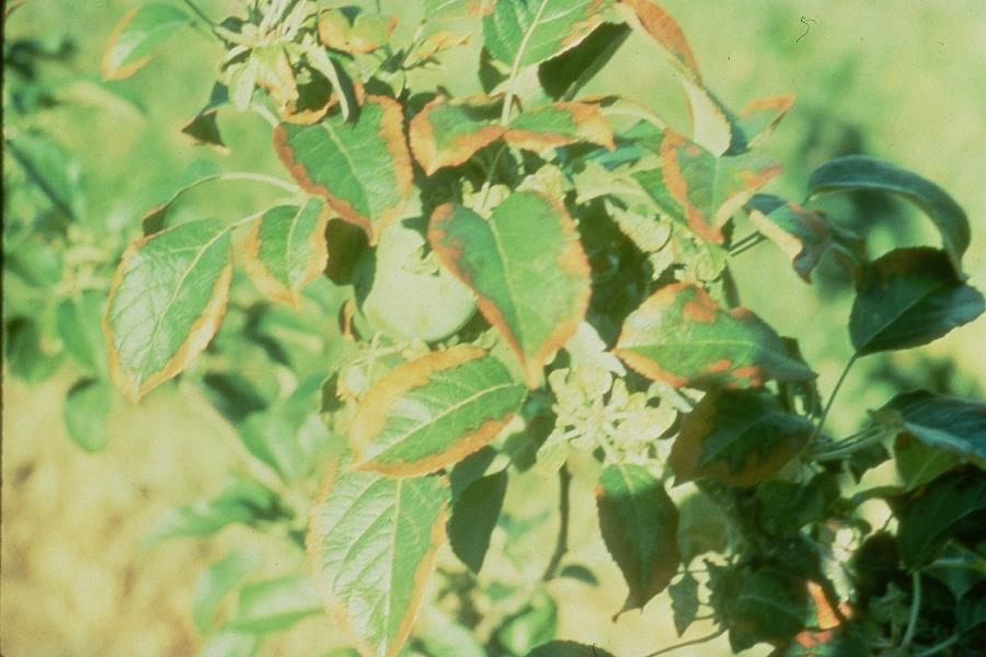Tipik olarak en yaşlı yapraklar necrosis yayılmadan önce tamamen sararır. Genç bitkide çoklu sarı yaprak Azot noksanlığı belirtisidir.