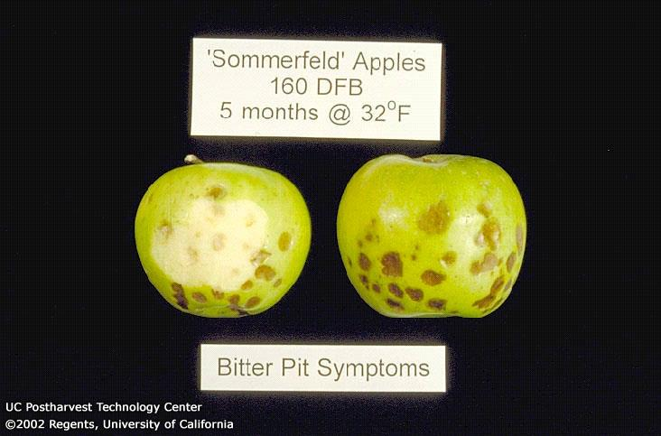 Meyveler yumuşar, meyve raf ömrü kısalır. Buna bağlı olarak kalsiyum noksanlığında şu hastalıklar görülebilir;