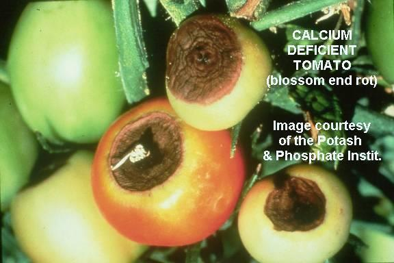 Domatesteki çiçek burnu çürüklüğü önemli bir Ca eksikliği belirtisidir ve genelde bitkideki su stresi de bu belirti oluşumunu uyarıcıdır.