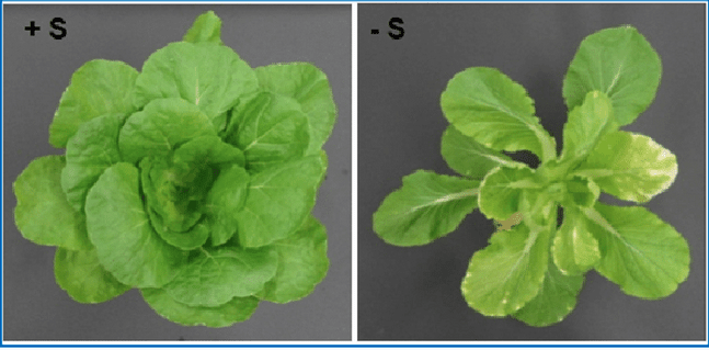 Kükürt noksanlığında tıpkı Azot noksanlığı gibi homojen bir kloroz gözlenir. Ancak aradaki fark ==Azot noksanlığında kloroz yaşlı yapraklardan başlarken, Kükürt noksanlığında kloroz genç yapraklarda başlar== Çünkü Kükürt mobil değildir, genç yapraklara taşınamaz